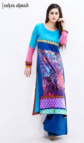 Zahra Ahmed is one of the most inspiring and creative fashion designer of Pakistan. Who has given the new dimensions to fashion industry and has taken the Zahra Ahmad fashion brand on the peak of success. Now Zahra ahmad has admired by all and sundry. Zahra Ahmad unforgettable fashion journey is continue; and few days ago zahra ahmad summer collection 2014 has been forwarded to join the journey of success. At first session Zahra Ahmad Sheesh Mahal Party wear has been included and later has edited with Casual Wear in zahra ahmad collection 2014. But today we aren't focusing on Zahra Ahmad Party wear collection 2014; and instead of bringing Smart Casual Dresses, because- it has gained prominence. Latest Summer Casual Wear 2014 is powerful invention of women clothing styles; that has designed with the inspiration of modern and classy designs. For this semiformal dresses come casual wear 2014; Zahra has used own formulate patterns with the designer skills on clean tailoring lines. Moreover! highlighted with feminine and whimsical designs, Therefore Zahra Ahmad Summer Casual Wear Collection 2014 became hugely popular among ladies. For upcoming summer weather Long shirts in tail styles, funky dresses with drop cornet designs and loose and baggy styles of Smart Casual Dresses Fashion has been introduced with small scale on thread embroidery, statement button, laces and prints decoration. Every type of Shirt has been paired with Printed come embroidered palazzo trousers to give you highest level of comfort. Lawn, Cotton and linen fabric would be great deal for sophistication. Let's have a look at Zahra Ahmad Smart Casual Dresses 2014.