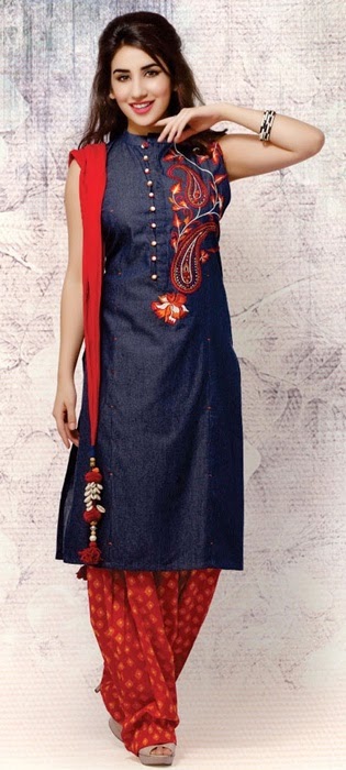 Denim is always in fashion, this evergreen fabric was used in Unites states for jeans; and later fashion designer has introduced stretchable denim skirts, blouses, jacket, jumpsuits and other western wear. But today one of Asian fashion brands has brought girls denim salwar kameez. Denim has softest texture with high absorbent quality, stretchable flair gives comfort and known as summer friendly cloth. Denim traditional color was blue and it looks quite elegant; therefore clothing merchandiser has pointed out the blue denim shade and interestingly has dipped in classic but colorful thread embroideries. Denim Embroidered Salwar Kameez has been designed with contrasted hues; like fashion artist has creatively paired the blue denim with red, green and yellow and presented very traditional dressing style like salwar kameez, anarkali suits and kurta pajama clothing on classic denim. The premium denim quality is differentiating the trend from others, and denim dresses modern sewing with absorb-able standard will beat the heat faster than other fabrics. in Girls Denim Clothing you can find angrakha on denim with salwar, kurti with churidar, frocks with churidar trouser and long shirt with shalwar, so it's totally depends on you what you pick for your summer trends to add twist of denim instead of lawn or chiffon.